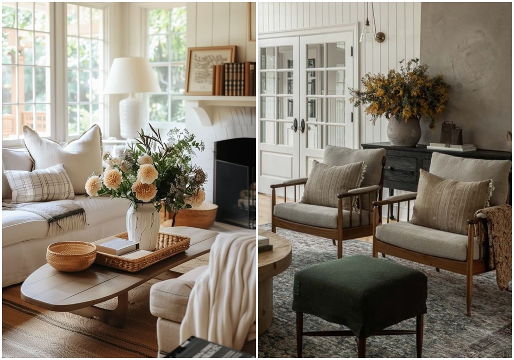 მცენარეებიც სასურველი დამატებაა - ყვავილების ქოთნები, თაიგულები, კუთხეში მოთავსებული გამხმარი ყვავილები - ეს ყველაფერი ინტერიერს აახლებს და ქმნის ცოცხალ, ბუნებრივ ატმოსფეროს.