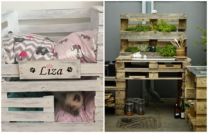 ჩვენს ოთხფეხა მეგობრებსაც უყვართ აგარაკზე დასვენება, რომლებსაც ასევე სურთ ჩრდილში ადგილის პოვნა ან მზეზე თბილად ყოფნა. ააწყვეთ მისთვის კომპაქტური, მაგრამ კომფორტული საწოლი პალეტებისგან. დიზაინი შეიძლება იყოს აბსოლუტურად ნებისმიერი: დაბალი, მაღალი, მრავალიარუსიანი, გვერდებით ან მათ გარეშე. არ დაგავიწყდეთ რბილი ლეიბის, საბნის ან ბალიშის დამატება. თუ პალეტები კაშკაშა ფერებში შეღებავთ ან დეკორატიული ელემენტებით გააფორმებთ, შეზლონგს ნებისმიერი აგარაკის ინტერიერის უნიკალური ელემენტი გახდება.
