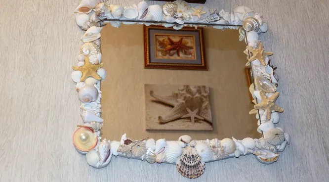კიდევ ერთი წარმატებული ვარიანტია სარკის ნიჟარებით ან სხვა საზღვაო თემატიკის მასალებით (კენჭები, მძივები, ფიგურები) გაფორმება. "საზღვაო" ჩარჩო არ უნდა იყოს სიმეტრიული - ასიმეტრია არანაკლებ მომხიბვლელად გამოიყურება. იმისათვის, რომ მისი ელემენტები საიმედოდ დამაგრდეს, გამოიყენეთ ცხელი წებო და არ დაგავიწყდეთ დასრულებული ჩარჩოს გამჭვირვალე ლაქით დაფარვა.