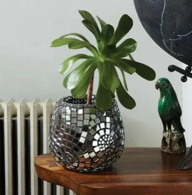 თუ ძველი ყვავილების ქოთნები ჯერ კიდევ საკმაოდ მყარია, მაგრამ აღარ გამოიყურება ეფექტურად, დაფარეთ მათი ზედაპირი სარკის ნაჭრებით. დაფარეთ ქოთანი თიხის ფენით და დააფიქსირეთ სარკის ფრაგმენტები მასში, სანამ თიხა არ