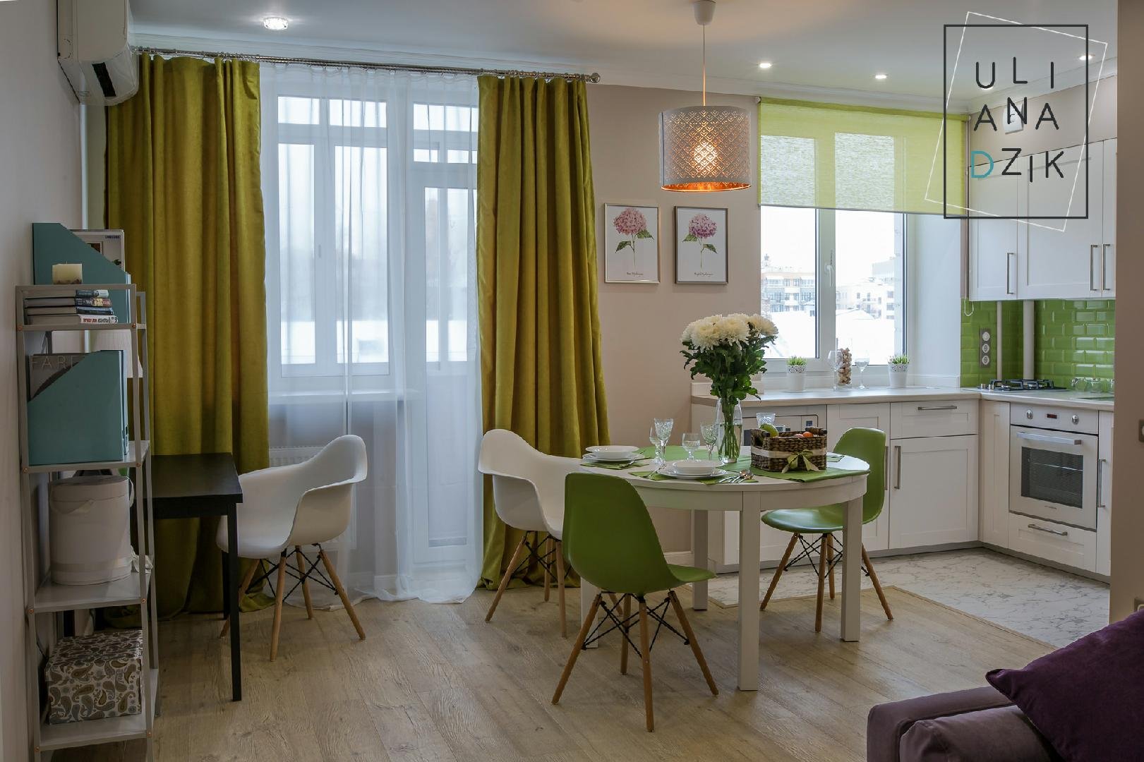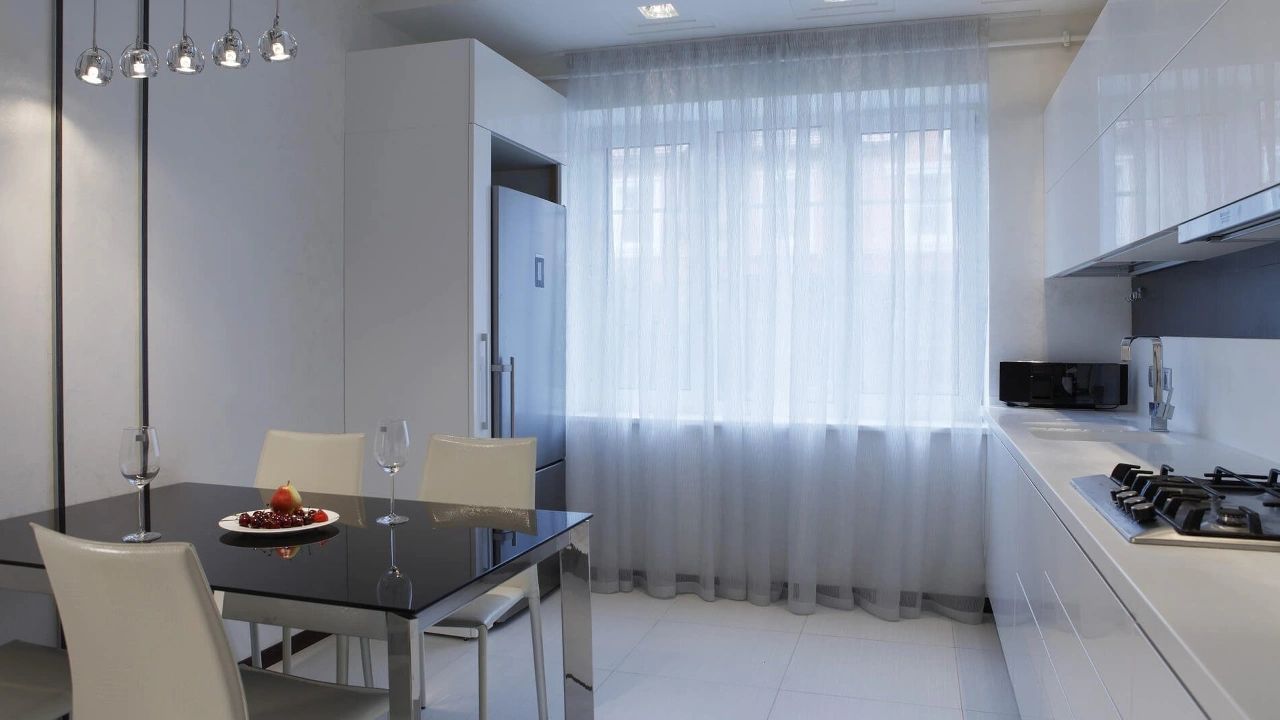 დიდი სამზარეულოები, სადაც სივრცის ყოველი სანტიმეტრი მნიშვნელოვანია, აღჭურვილია იატაკამდე სიგრძის ფარდებით, რომლებიც შეიძლება მოცულობით გამოიყურებოდეს და ინტერიერს ამძიმებდეს. მოკლე ფარდები, რომლებიც ფანჯრის რაფამდე ან მის ქვემოთ აღწევს, ოპტიმალური გადაწყვეტაა - ისინი არ ერევა სამუშაო ზედაპირს და არ ქმნის ვიწრო სივრცის შეგრძნებას.