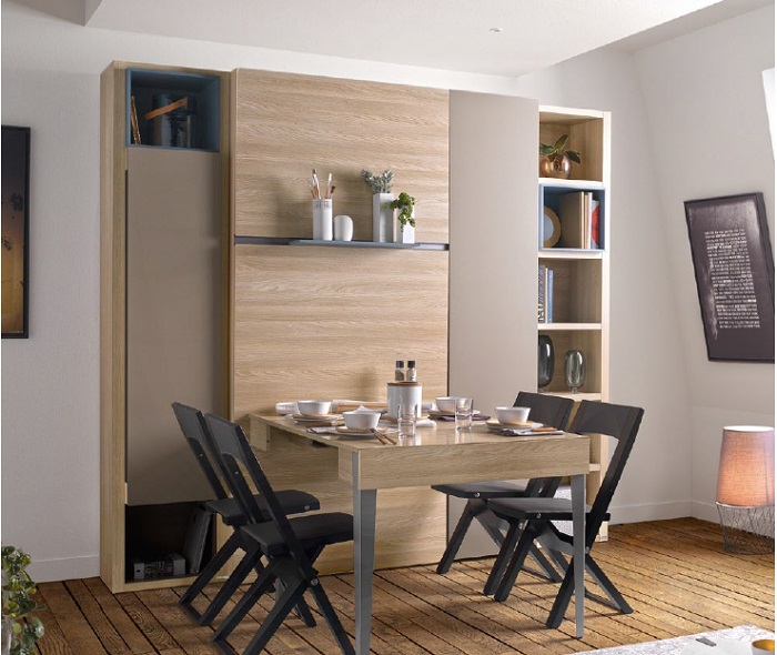 პატარა სამზარეულო, სადაც შემობრუნებაც კი რთულია, საჭმლის მომზადებაზე რომ აღარაფერი ვთქვათ, ბევრისთვის ნაცნობი პრობლემაა. თუ გიჭირთ როგორც სამუშაო, ასევე სასადილო სივრცის ოთახში განთავსება, გირჩევთ, მისაღებ ოთახში სასადილო სივრცე შექმნათ. ამისათვის განიხილეთ ჩაშენებული გადაწყვეტილებები. მაგალითად, მაგიდის ჩაშენება კარადაში.