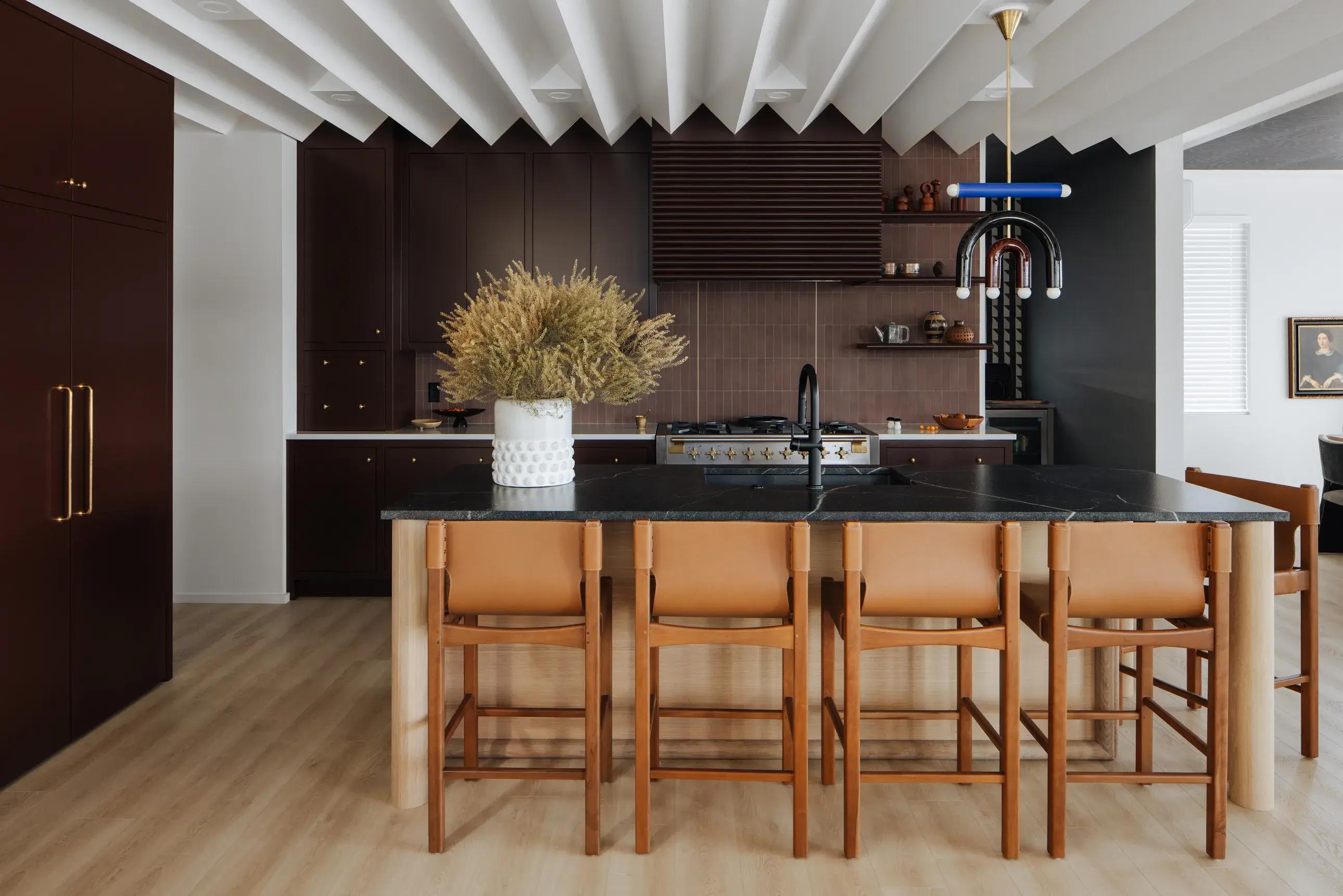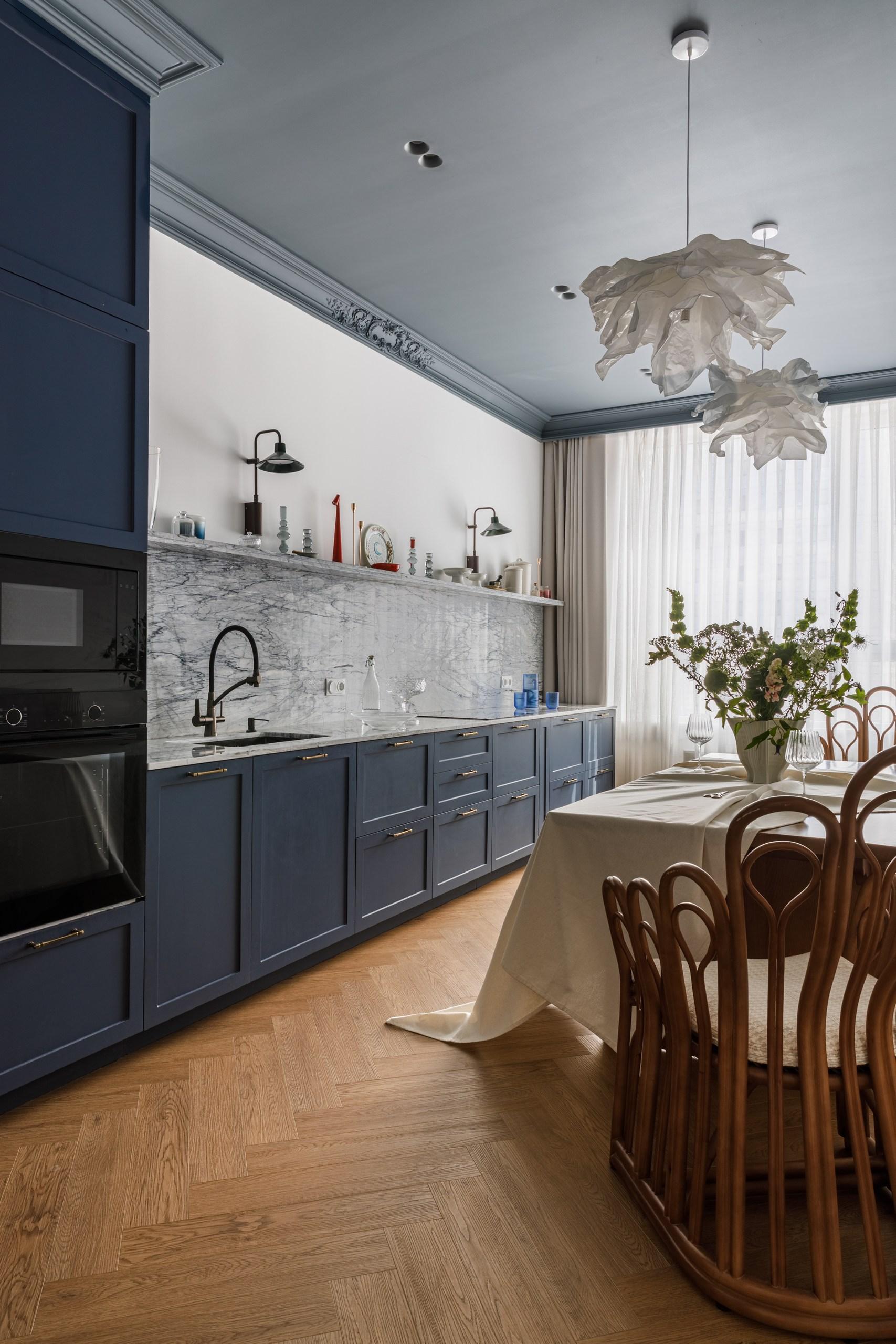 ამ პროექტში მონოქრომატული, მოსაწყენი ჭერი გამორიცხული იყო. ამ სახლის სამზარეულო უცნაური იდეის ადგილად იქცა: გეომეტრიული ნაკეცები. ისინი შეიქმნა დურგლების გუნდის მიერ და შეღებილი იყო კლასიკურ ნაცრისფერში. ჭერის გააზრებული ფორმა ქმნის სინათლისა და ჩრდილის საინტერესო ურთიერთქმედებას სივრცეში.