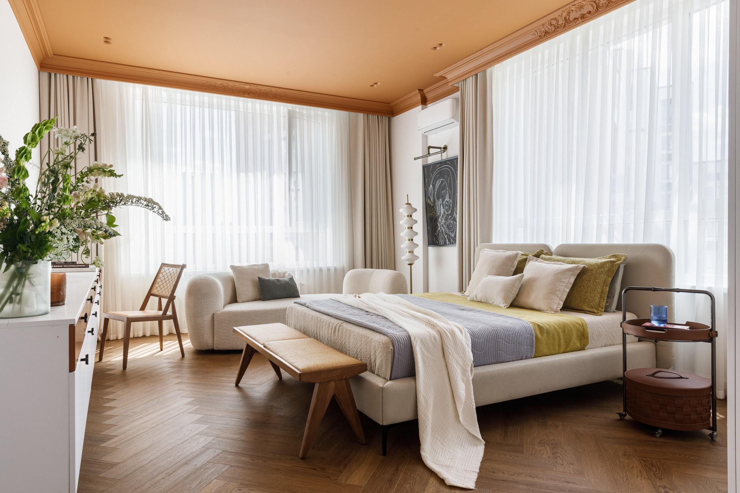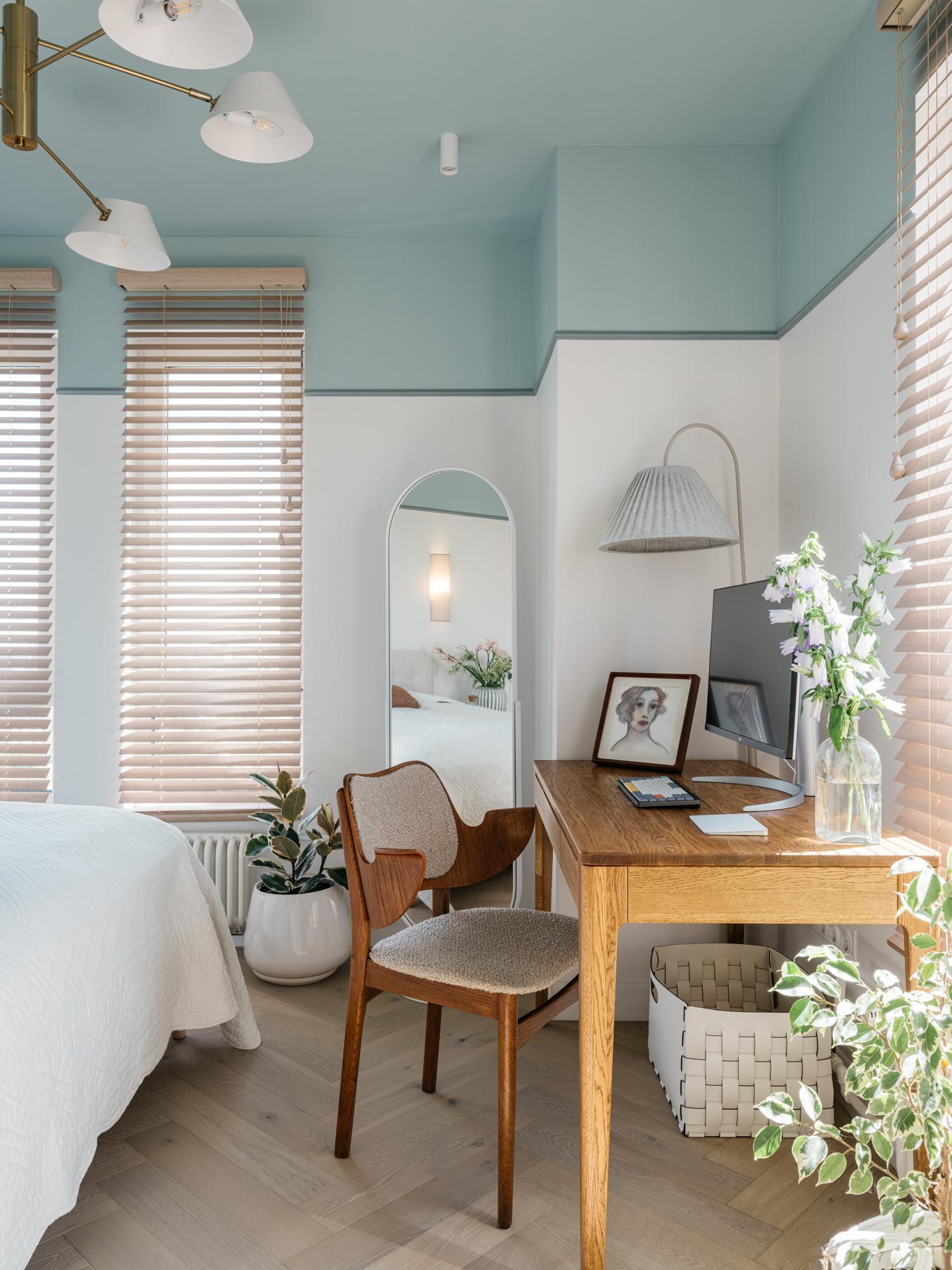 ამ საძინებელში ფერადი ჭერია. ეს გადაწყვეტილება ეწინააღმდეგებოდა მცირე სივრცეებისთვის ტრადიციულ რეკომენდაციებს, მაგრამ ამ შემთხვევაში ჭერი ოთახის ვარსკვლავი გახდა. "ფერი გამოხატვის ერთ-ერთი ყველაზე ხელმისაწვდომი ინსტრუმენტია, განსაკუთრებით შეზღუდული ბიუჯეტის შემთხვევაში, - ამბობს დიზაინერი.