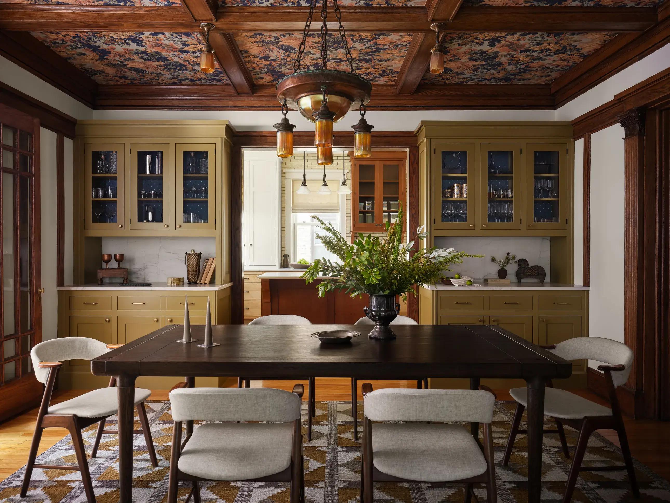დიზაინერ სარა მონტგომერისთვის, 1914 წლის ისტორიული აგურის სახლის განახლება ისტორიული ელემენტების ეკლექტიკურ აქსესუარებთან და დახვეწილ ფერებთან შერწყმის შესაძლებლობა იყო. განახლებული სასადილო ოთახის ნათურა გამოირჩევა ჭერზე პიერ ფრეის შპალერის ბოტანიკური პრინტით - "მსუბუქი და შთამბეჭდავი გადაწყვეტა", - აღნიშნავს მონტგომერი. კიდევ ერთი ნაწილობრივ შემონახული ისტორიული დეტალი, ო'ბრაიენ ჰარისის კარადები, ხელახლა შეიღება ნათელ ფერში.