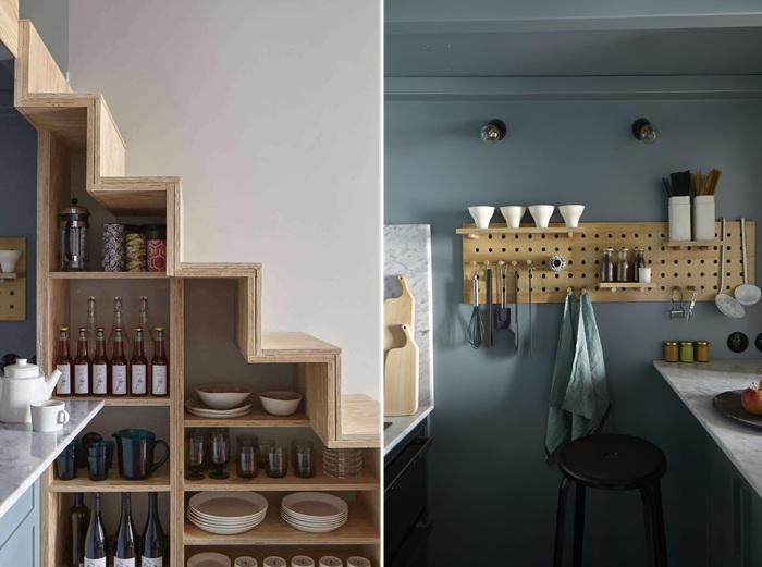 სამზარეულოს კუთხე, რომელიც ნაწილობრივ ფუნქციური კიბის ქვეშაა დამალული, საერთო კონცეფციას უჭერს მხარს. აქ, იატაკზე ორიგინალური კერამიკული ფილებია შენარჩუნებული, რაც იდეალურად ავსებს მარმარილოს დახლსა და ფილებს. ღია ნაცრისფერი კარადები, მათ შორის საუზმის მაგიდა, თეთრი კერამიკული ნიჟარა და ჭურჭლისა და ჭიქებისთვის განკუთვნილი დაფა, იდეალურად ეხამება საერთო იერსახეს.