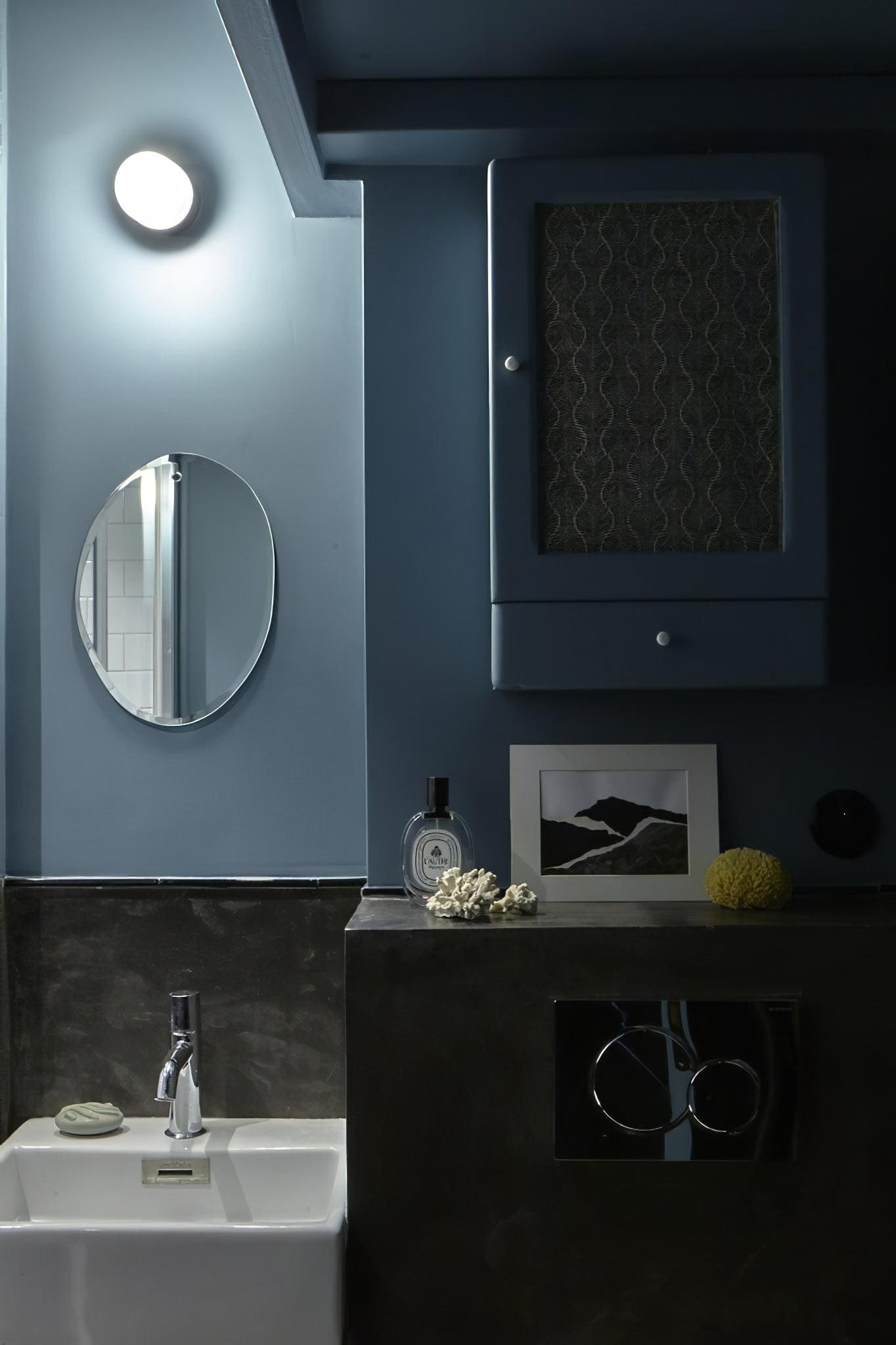 ლურჯკედლებიანი ბეტონის სივრცეში კომპაქტური კუთხეა შხაპისთვის, ჩაშენებული კარადისთვის, ნიჟარისთვის და ტუალეტისთვის, რომლებიც ცენტრალურ კომუნალურ ხაზებთან არის დაკავშირებული.