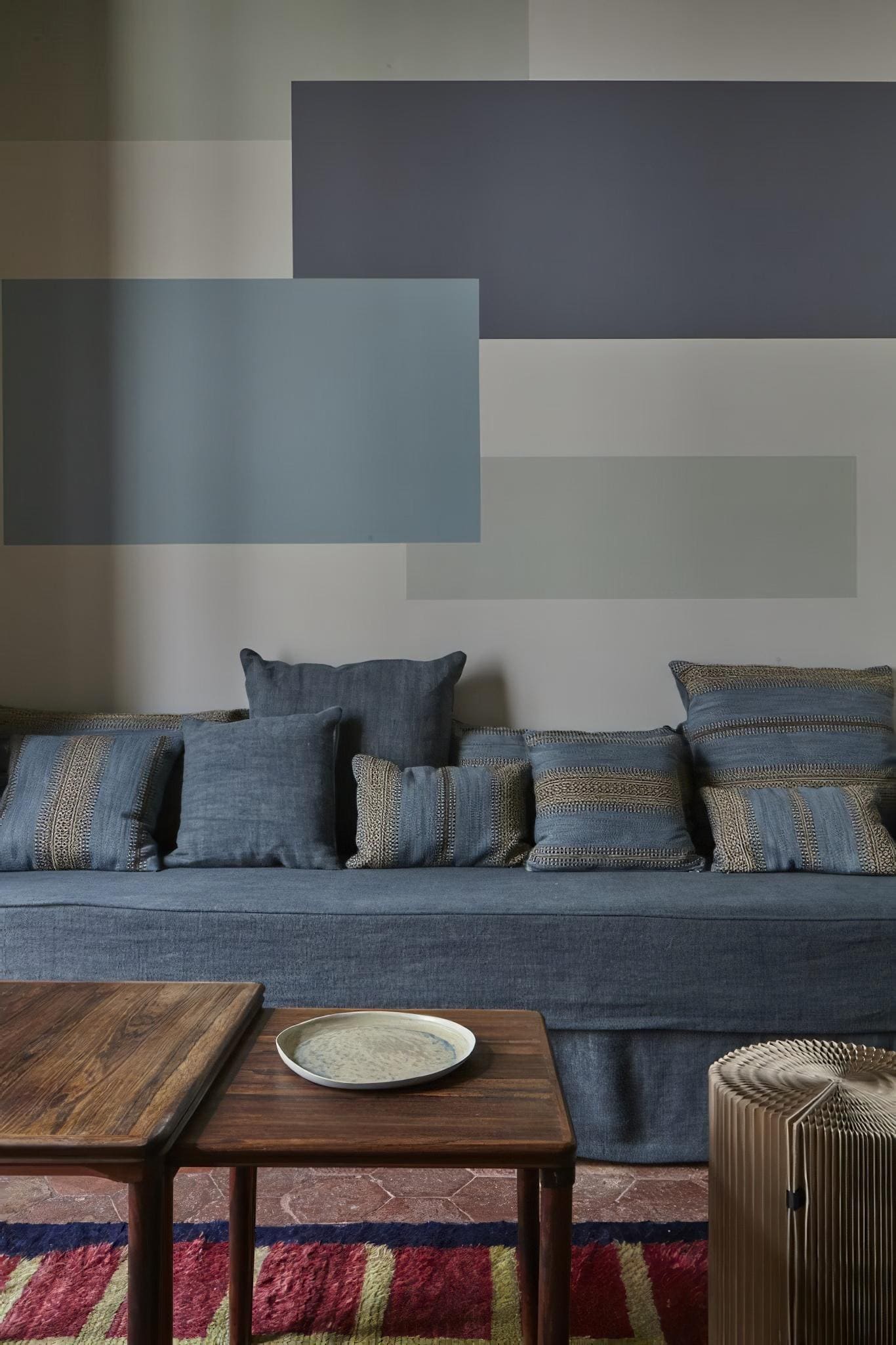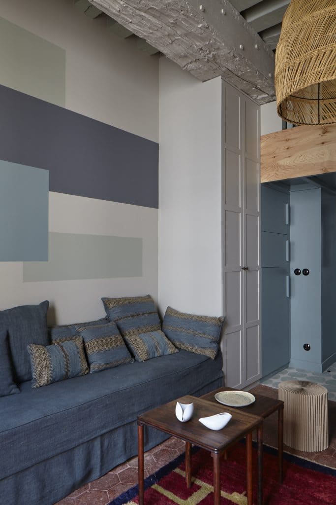 მთელი ოთახი ქვიშისფერ, ნაცრისფერ და ლურჯ ტონებშია გაფორმებული. ჩაშენებული კარადები ჰარმონიულად ერწყმის საერთო დიზაინს, რადგან ფასადები და კედლები იმავე ფერებშია შეღებილი, როგორც აქცენტირებული კედელი. დივნის უკან გეომეტრიული ნიმუში მთელი სახლის ფერთა გამას განსაზღვრავს. დიზაინერ მარიანას თქმით, ეს მე-18 საუკუნის შენობას თანამედროვე შტრიხს სძენს და ნამდვილ ხელოვნების ნიმუშად აქცევს. ყველაზე ნათელი კედელი შვეიცარიელი ფსიქიატრის, ჰერმან რორშახის აკვარელის სერიის საგამოფენო სივრცედ გადაკეთდა.