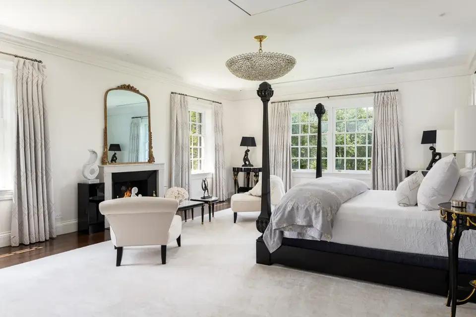 საძინებლის მთავარი ოთახი მოიცავს მისაღებ ოთახს, ბუხრიან აბაზანას და გასახდელ ოთახს შთამბეჭდავი შავი კარადებით.