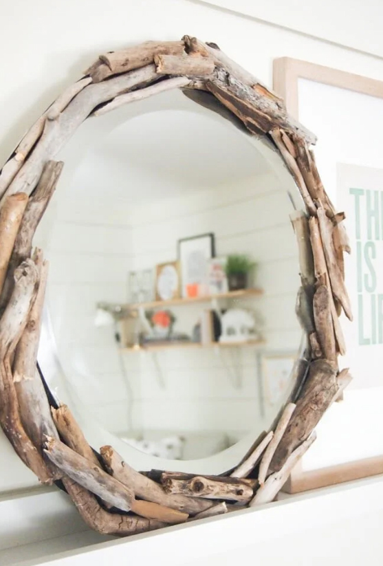 სასიამოვნო გზაა ხის ჩარჩოს დამზადება. შეგიძლიათ შეუკვეთოთ ლამაზი ანტიკვარული ჩარჩო, ან თავად აირჩიოთ დეკორი - მაგალითად, მთლიანი ტოტებით ან პატარა ნაჭრებით. ასეთი ორიგინალური ჩარჩო ნამდვილად არ დარჩება შეუმჩნეველი.