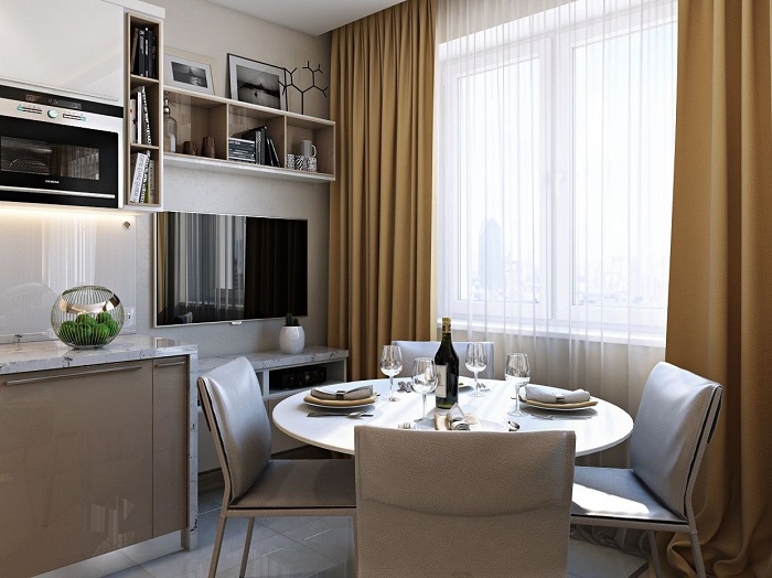 პატარა ბინებს ხშირად აქვს ფართო სამზარეულო. თუ ეს თქვენი ვარიანტია, გირჩევთ, სივრცის ნაწილი პატარა მისაღები ოთახისთვის გამოყოთ. აქ ბევრი ავეჯის განთავსება საჭირო არ არის - კომპაქტური დივანი, კედელზე დასამონტაჟებელი ტელევიზორი და რამდენიმე წიგნის თარო საკმარისი იქნება, თუ თავისუფალ დროს კითხვა გიყვართ.