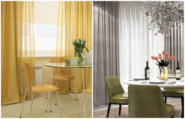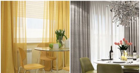 დიდი სამზარეულოები, სადაც სივრცის ყოველი სანტიმეტრი მნიშვნელოვანია, აღჭურვილია იატაკამდე სიგრძის ფარდებით, რომლებიც შეიძლება მოცულობით გამოიყურებოდეს და ინტერიერს ამძიმებდეს. მოკლე ფარდები, რომლებიც ფანჯრის რაფამდე ან მის ქვემოთ აღწევს, ოპტიმალური გადაწყვეტაა - ისინი არ ერევა სამუშაო ზედაპირს და არ ქმნის ვიწრო სივრცის შეგრძნებას.