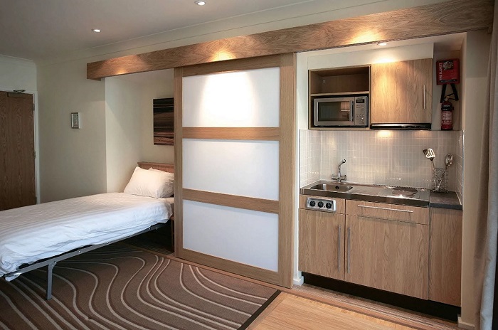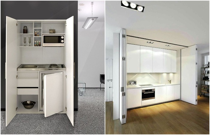 თუ ეს ვარიანტი თქვენთვის შესაფერისი არ არის, შეგიძლიათ ღუმელი, ნიჟარა და სამუშაო მაგიდა კარადაში დამალოთ. საჭიროების შემთხვევაში, იქ მინი-მაცივრის ადგილიც კი არის. ეს გადაწყვეტა იდეალური იქნება დღიურად გასაქირავებელი ბინისთვის ან სტუდიოს ტიპის ბინისთვის, სადაც მცხოვრებლები იშვიათად ამზადებენ.