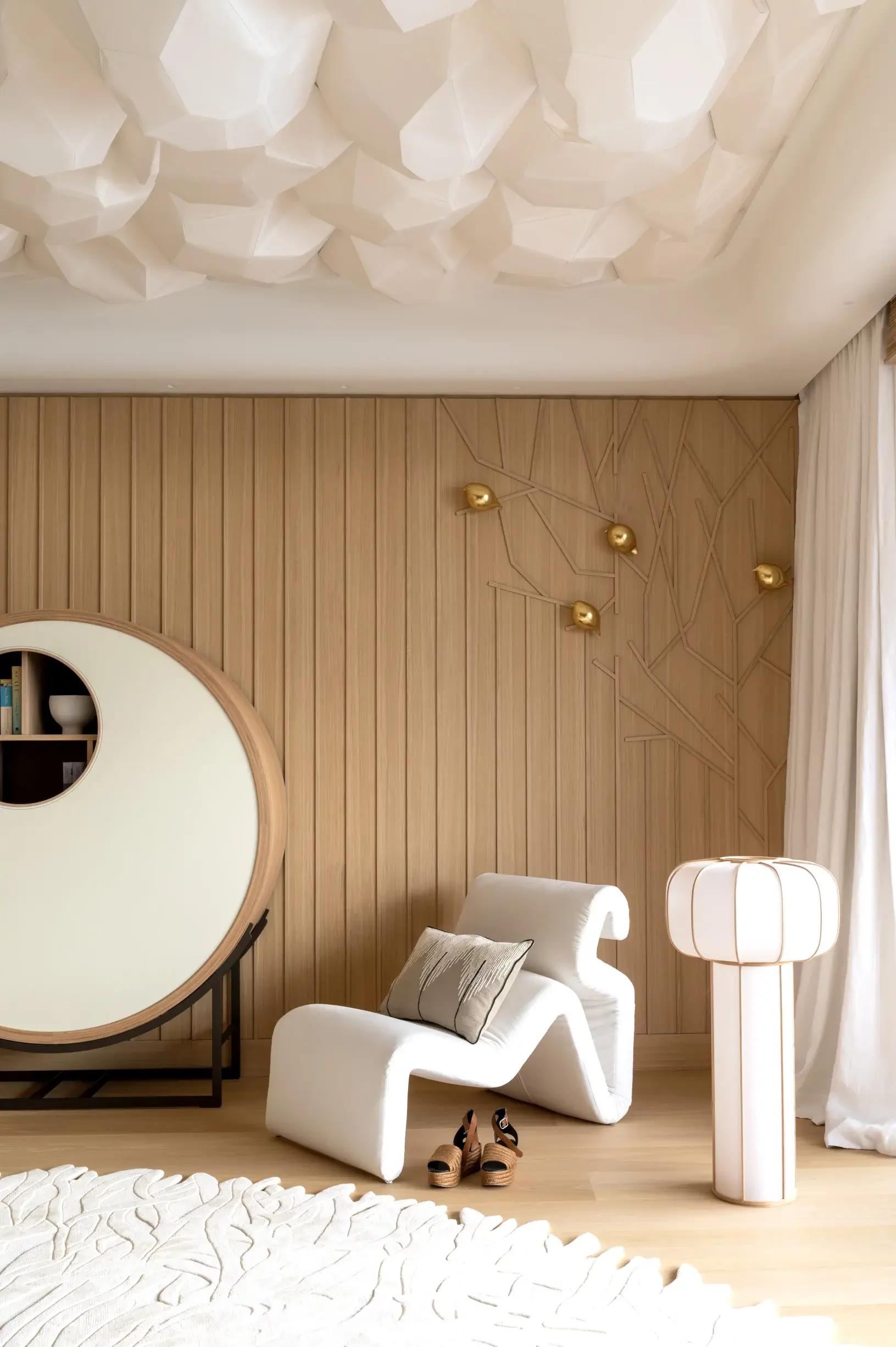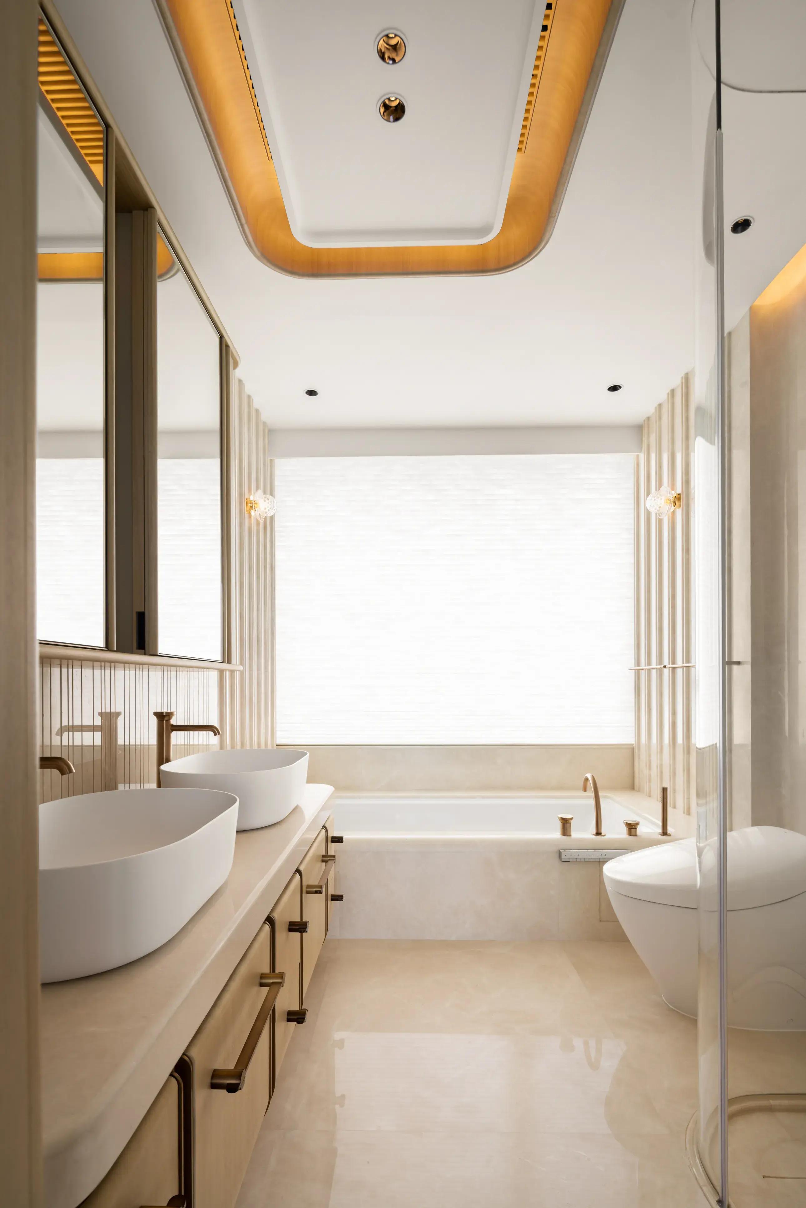 "ჭერი ხშირად ყველაზე მოკრძალებული ზედაპირია, მაგრამ მას შეუძლია სივრცის მნიშვნელოვანი დამამთავრებელი შტრიხი იყოს", - ამბობს ჰონგ-კონგელი დიზაინერი კლემენტ ჩენგი. ამ პროექტში, აბაზანაში ინდივიდუალური, ნათელი განათება კონტრასტს ქმნის ჭერის, იატაკისა და აბაზანის ნეიტრალურ ტონებთან.