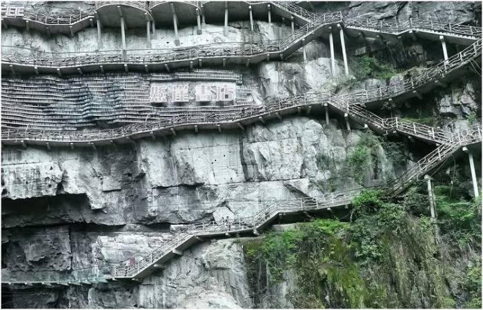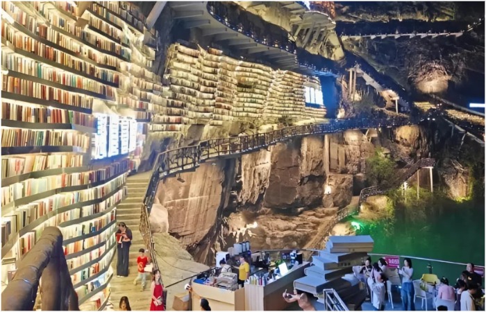 ჩინეთში, 300-მეტრიანი კლდის პირას, განსაცვიფრებელი წიგნების მაღაზია გაიხსნა, რომელიც თან ბიბლიოთეკის ფუნქციებს ითავსებს. ბევრს სჯეროდა, რომ პროექტი ხელოვნური ინტელექტის მიერ იყო შექმნილი, რადგან ფოტოები არარეალურად გამოიყურებოდა. აღმოჩნდა, რომ მაღაზია რეალურად არსებობს და პოპულარულია (პირველ რიგში, ბლოგერებსა და ტურისტებში, რომლებსაც უჩვეულო სტრუქტურის ფონზე ფოტოების გადაღება სურთ). სინამდვილეში, ეს წიგნის მაღაზია უბრალოდ საცალო სივრცეზე ან სელფებისთვის იდეალურ ფონზე მეტია; ის ასევე მაგალითია იმისა, თუ როგორ ერწყმის თანამედროვე დიზაინი ბუნებას, ქმნის უჩვეულო და თვალისმომჭრელ კომბინაციებს.